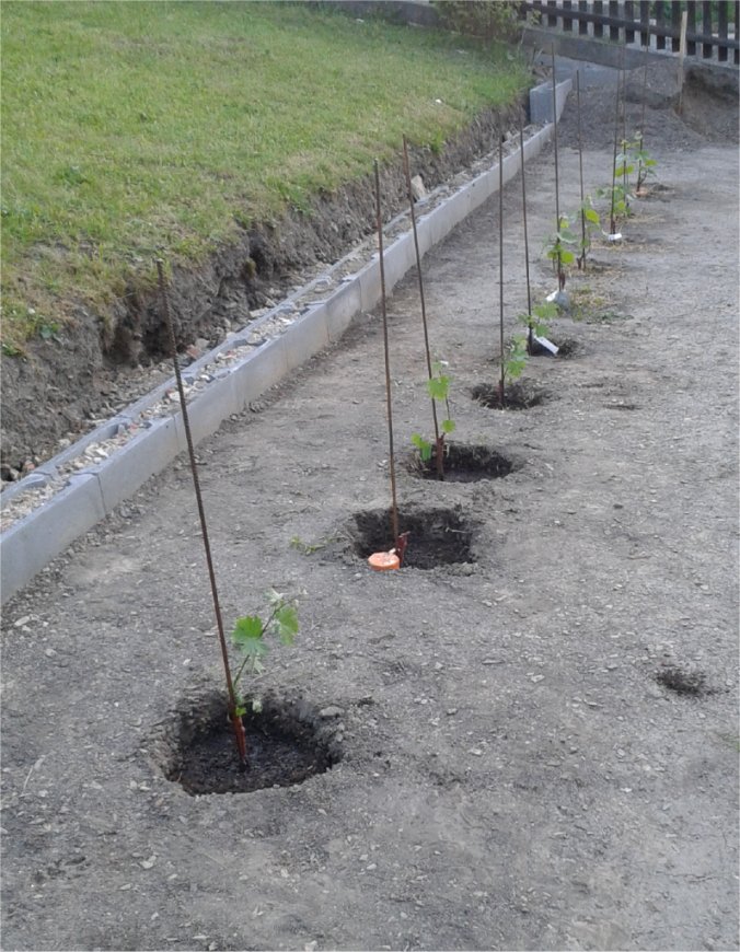 Ryzlink vlašský je v zemi. Hurá. Zbývá vyhloubit 5 děr a do nich zasadit Tramín. Bohužel se stala drobná nehoda a při manipulaci mi upadl výhon. Naštěstí tam je ještě jeden "záložní", ale ten má nyní necelý 1cm. Takže tato hlava bude asi trošku ve skluzu. Na fotce je to ten druhý u budoucího sloupku (oranžové víčko). No a...