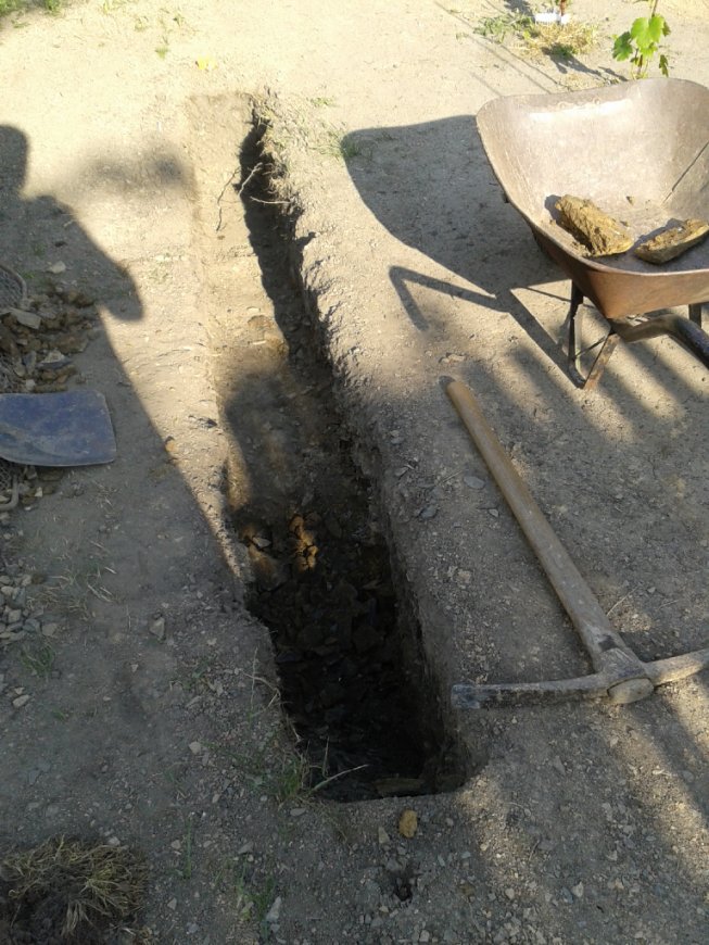 Zbývá mi zasadit Tramín. Od hlubinných vrtů do břidlice jsem pro tuto odrůdu upustil, bylo to příliš pracné. Rozhodl jsem se pro výkop kynety (kyneta = výkop pro kabelovou trasu). Délka výkopových prací bude přibližně 3 metry a hloubka výkopu kolem 50 cm a šířka na lopatu. Takže předtím jsem pro výsadbu RV a Hi používal štanglu, kelňu...
